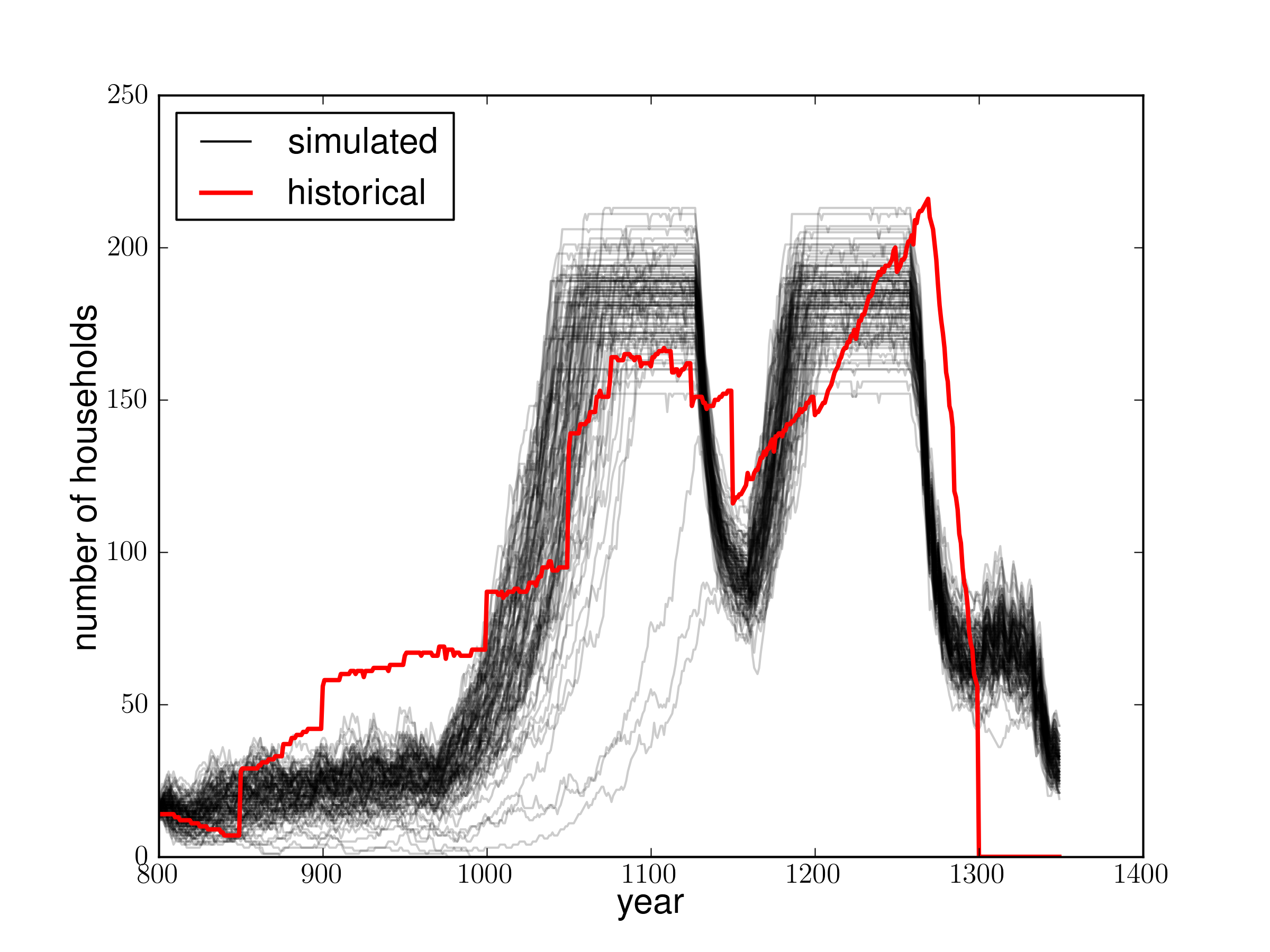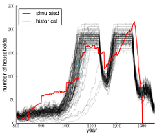 In this work, which is particularly inspired by John Miller's work on active nonlinear testing, I showed how genetic algorithms could calibrate the model parameters to best match archaeological data, and also how genetic algorithms could perform sensitivity analysis by searching for nearby parameters that yield a poor fit with the data. In addition, this approach to sensitivity analysis led us to discover a small bug in the model's code.