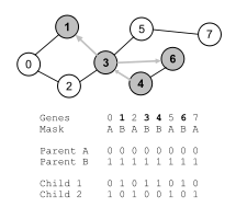 A simple contagion model on the network chooses a mask to determine which genes get swapped during crossover.
