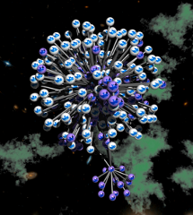 The following (artistically ray-traced) visualization video of the agent-based model portrays how the adoption of a product might cascade through a 1000-node Twitter subgraph. Agents that haven't adopted the product yet are shown as birds on white spheres, and agents that have adopted the new product are shown as hat-wearing birds on purple spheres.