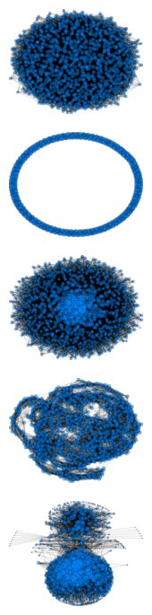 Network visualizations: Erdős–Rényi random graph, lattice, preferential attachment, small-world, Twitter subnetwork